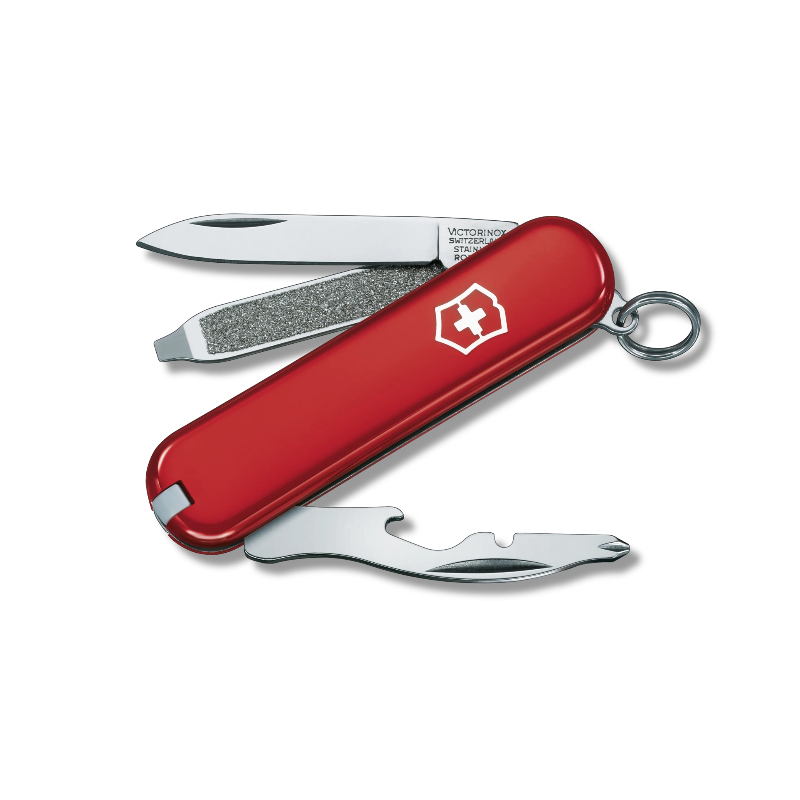 Hoja pequeña / Destornillador 2.5 mm / Anilla / Destornillador Phillips 0/1, magnético / Pinzas / Palillo de dientes / Lima de uñas / Destapador / Pela cables