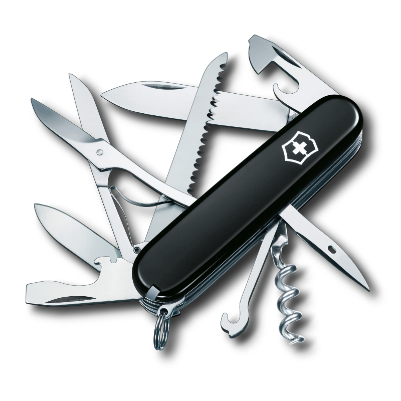 Hoja grande / Hoja pequeña / Sacacorchos / Punzón, escariador y aguja de coser / Tijeras / Sierra para madera / Gancho multiuso / Anilla / Pinzas / Palillo de dientes / Abrelatas / Destapador / Destornillador 6 mm / Destornillador 3 mm / Pela cables