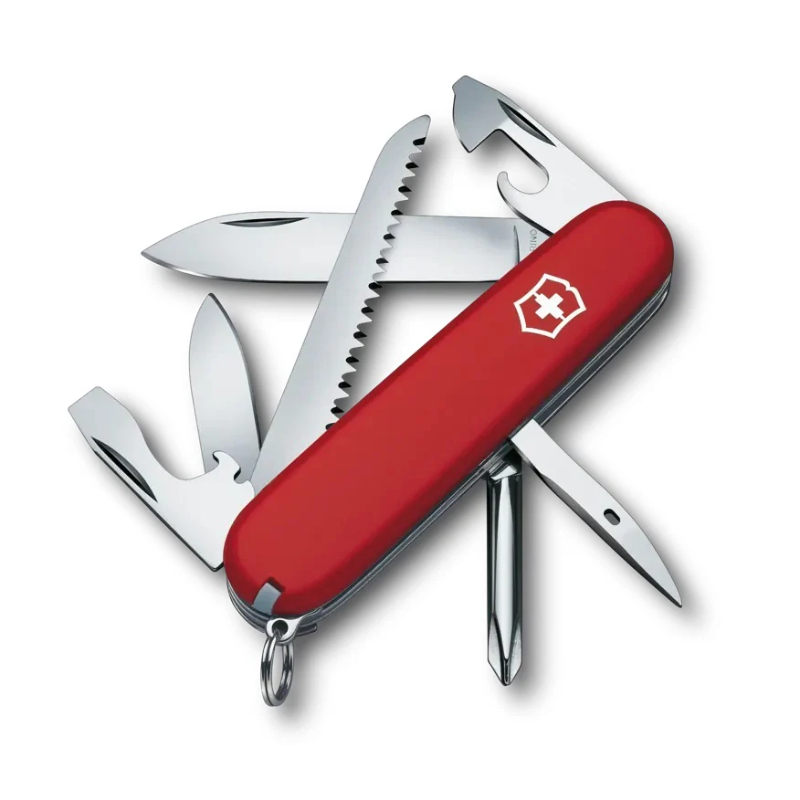 Hoja grande / Hoja pequeña / Punzón, escariador y aguja de coser / Sierra para madera / Destornillador Phillips 1/2 / Anilla / Pinzas / Palillo de dientes / Abrelatas / Destapador / Destornillador 3 mm / Destornillador 6 mm / Pela cables