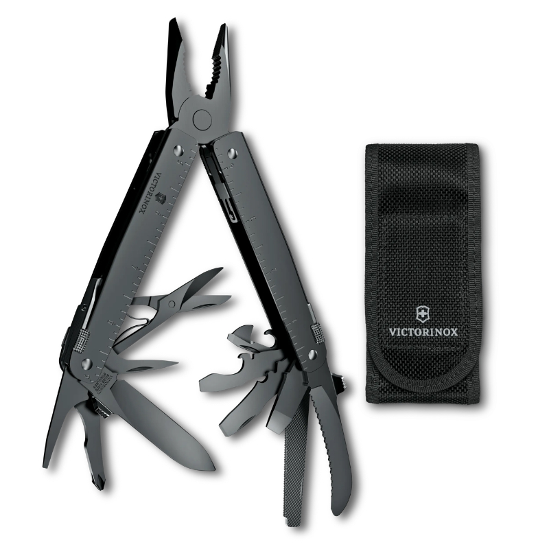 Alicate multiuso de punta fina / Corte para alambre delgado y suave hasta 40 HRC / Corte para alambre endurecido / Hoja grande / Sacacorchos / Mini-destornillador de 1.5 mm / Abrelatas / Destornillador 3 mm / Destapador / Destornillador 6 mm / Palanca / Curvador de alambres / Destornillador 2 mm / Punzón escariador / Gancho para tirar / Tijeras / Sierra para madera / Sierra para metal / Lima metálica / Destornillador Phillips 1/2 / Llave de tuercas / Caja de puntas / Espacio para bits adicionales / Bit Phillips 0 / Bit Phillips 3 / Bit Hex 3 / Bit Hex 4 / Bit Torx 10 / Bit Torx 15 / Formón de 7 mm y raspador / Pela cables corte longitudinal / Pela cables corte circular / Pela cables y raspador / Ojal de fijación / Coupling for corkscrew and carry clip