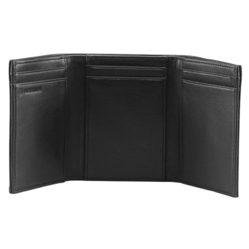 Cartera de piel de triple pliegue (trifold) con compartimento para identificación, ranuras para tarjetas y bolsillos para recibos. Dimensiones: 8.5 cm de ancho x 10.5 cm de alto x 3 cm de profundidad.