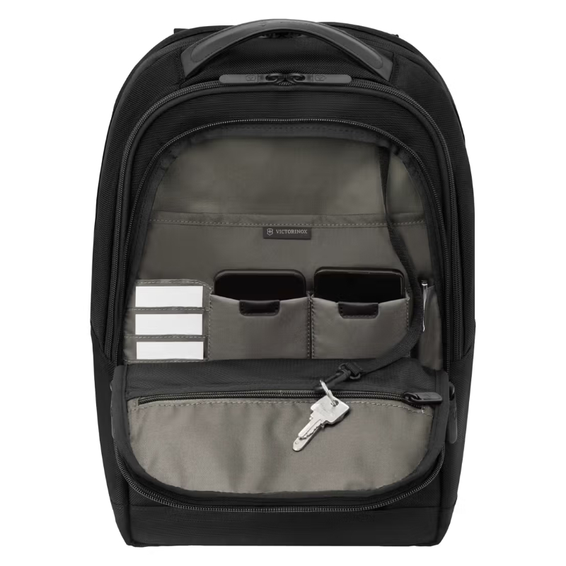 Una mochila elegante y duradera para uso profesional, diseñada para llevar una laptop de hasta 15.4″ y otros elementos esenciales de negocios. Cuenta con un organizador extraíble para cargadores, cables y bolígrafos.