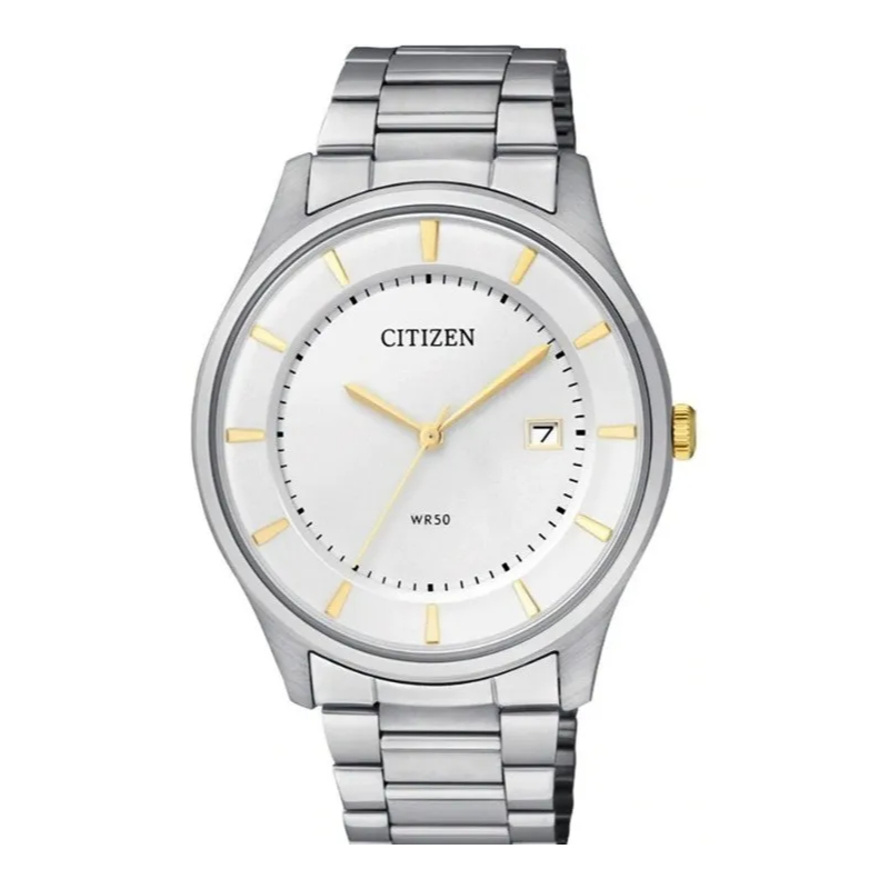 Reloj analógico de cuarzo para caballero con un diseño elegante en acero inoxidable bitono (plateado y detalles dorados). Cuenta con una carátula blanca, fechador y 50 metros de resistencia al agua.