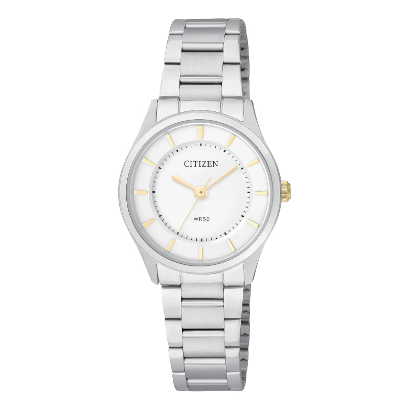 Reloj analógico de cuarzo para dama. Presenta un estilo clásico y minimalista con caja y correa de acero inoxidable plateado, carátula blanca y función de fecha. Resistencia al agua: 50 metros.