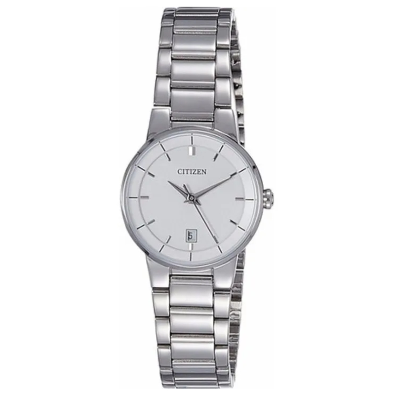 Reloj de dama con un diseño clásico en acero inoxidable plateado. Carátula blanca y función de día/fecha. Resistencia al agua: 50 metros.