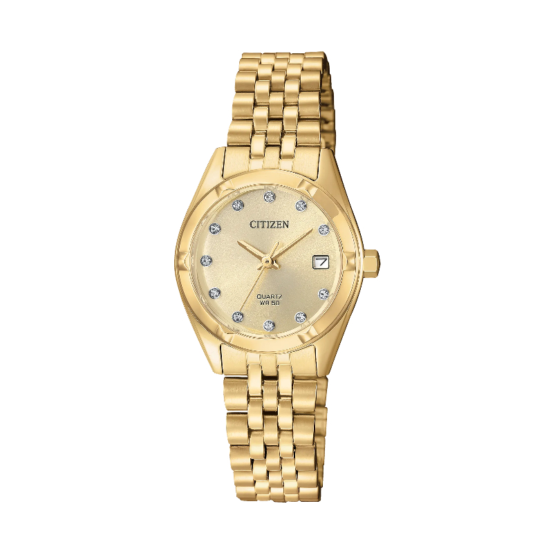 Reloj de dama con un diseño atractivo en tono dorado. Carátula champán/dorada e indicadores de día y fecha. Resistencia al agua: 50 metros.
