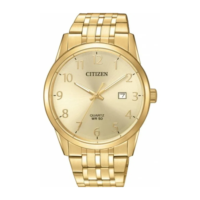 Reloj de caballero con diseño en tono dorado, carátula champán/dorada y fechador. Resistencia al agua: 100 metros.