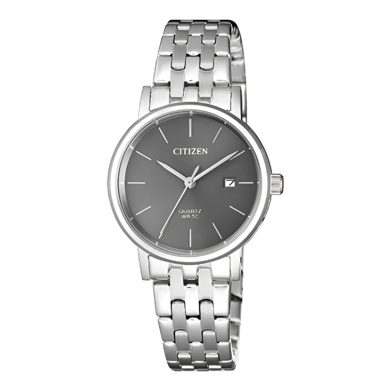 Reloj de dama con un diseño elegante en acero inoxidable. Cuenta con carátula gris, función de día/fecha y movimiento de cuarzo. Resistencia al agua: 50 metros.
