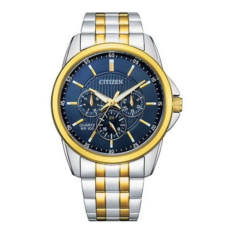 Reloj de caballero multifunción en acero inoxidable tono dorado con carátula azul. Muestra dÃa, fecha y formato 12/24 horas. Resistencia al agua: 50 metros.