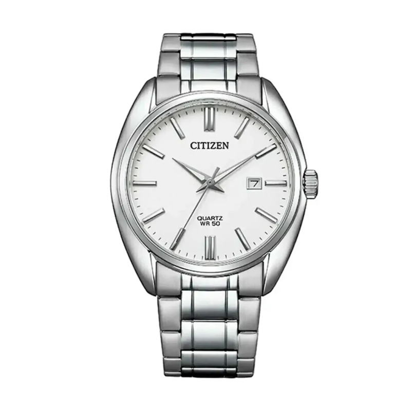Reloj de caballero con un diseño moderno y sencillo en acero inoxidable plateado. Carátula blanca y fechador. Resistencia al agua: 100 metros.