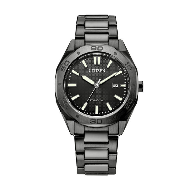 Reloj de caballero Eco-Drive con diseño industrial/militar en acero inoxidable, carátula gris y función de fecha. WR: 100 metros.