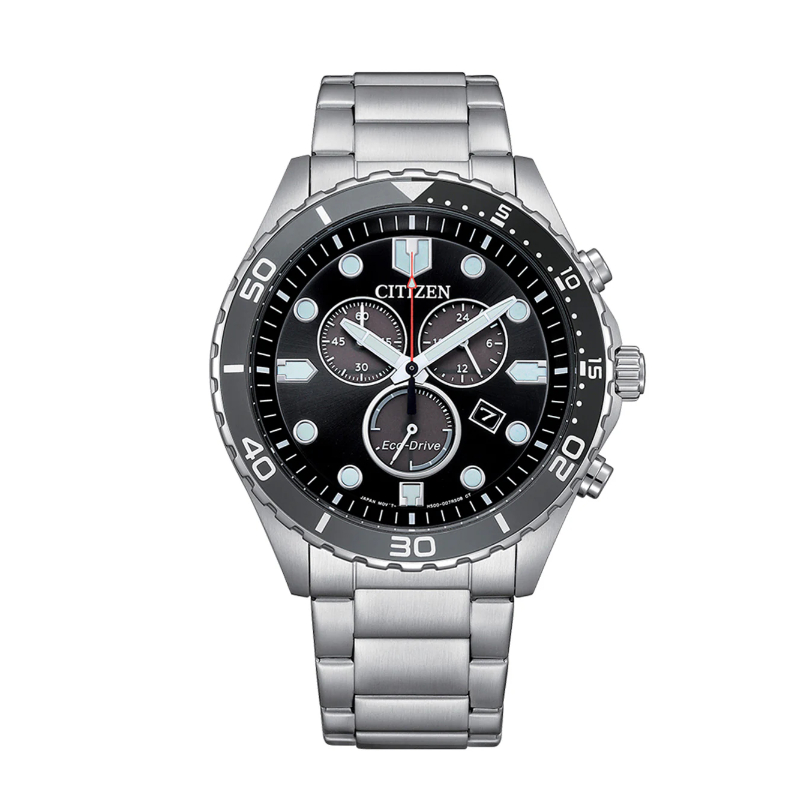 Reloj de caballero con función de cronógrafo y taquímetro, tecnología Eco-Drive. Diseño deportivo en acero inoxidable negro. WR: 100 metros.