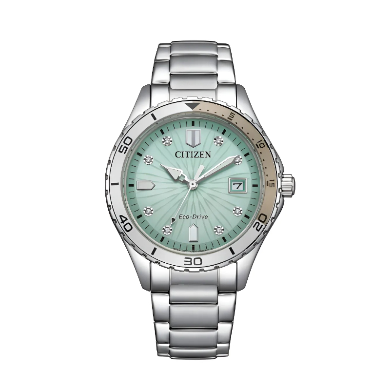 Reloj deportivo casual para dama con movimiento Eco-Drive, caja y brazalete de acero inoxidable y carátula azul. WR: 50 metros.
