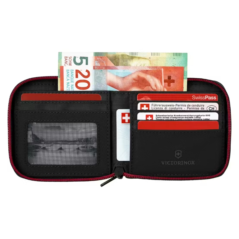Billetera con un cierre envolvente (zip-around) que ofrece seguridad adicional para todos los contenidos. Cuenta con cinco ranuras para tarjetas, una ventana transparente para identificación, y un práctico bolsillo con cremallera para monedas. También incorpora forro protector RFID.