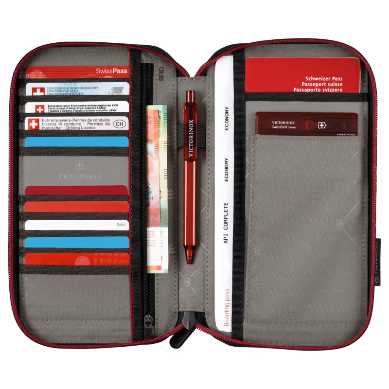 Un organizador de viaje completo diseñado para guardar de forma segura tarjetas, documentos, pasaportes y objetos de valor en un solo lugar. Cuenta con protección RFID para resguardar datos personales, 10 ranuras para tarjetas, un bolsillo con cierre para monedas, portaplumas y un revestimiento antimicrobiano para inhibir el desarrollo de microbios.