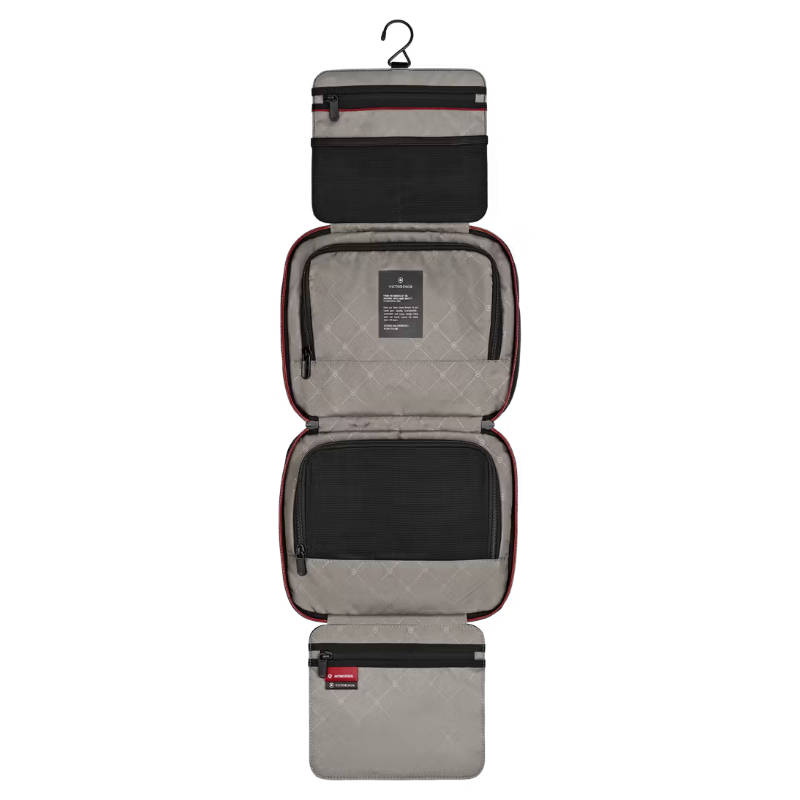 Estuche de aseo versátil diseñado para una organización eficiente durante el viaje. Cuenta con un gancho para colgar que permite un acceso cómodo, por ejemplo, en una barra de ducha o toallero. El neceser incluye un revestimiento antimicrobiano que inhibe el desarrollo de microbios, y un compartimento resistente a derrames con un forro fácil de limpiar para asegurar la higiene y contención.