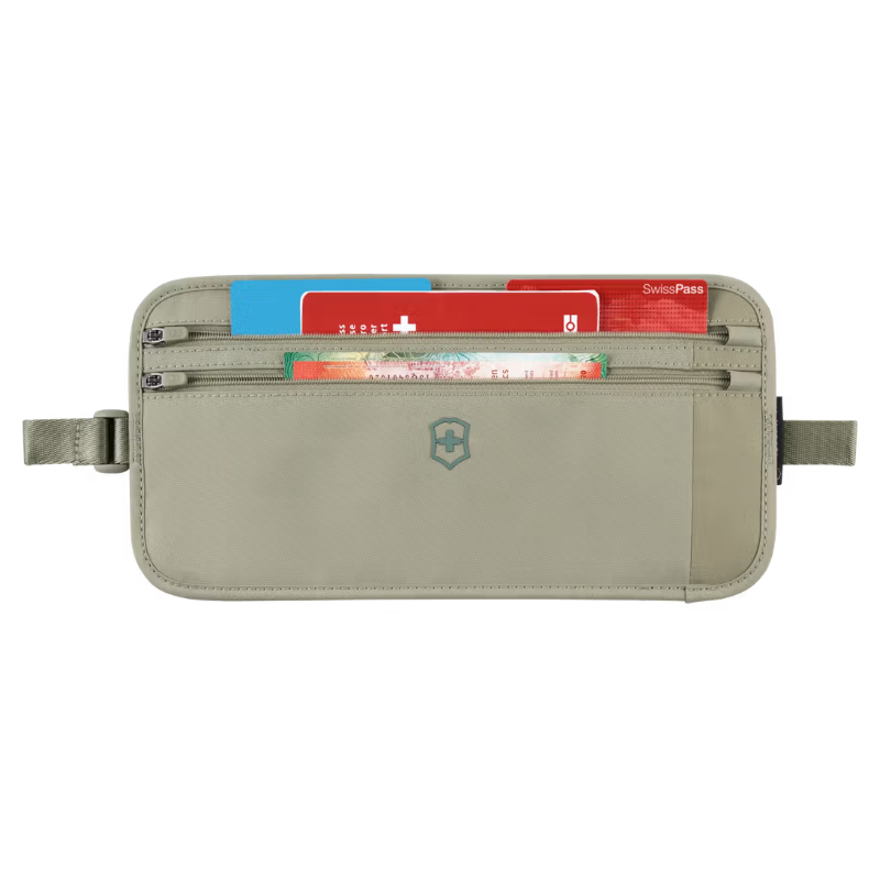 Un accesorio de viaje ultradelgado y ligero que se desliza fácilmente bajo la ropa, pasando desapercibido. Está fabricado en poliéster y cuenta con características de seguridad avanzadas: