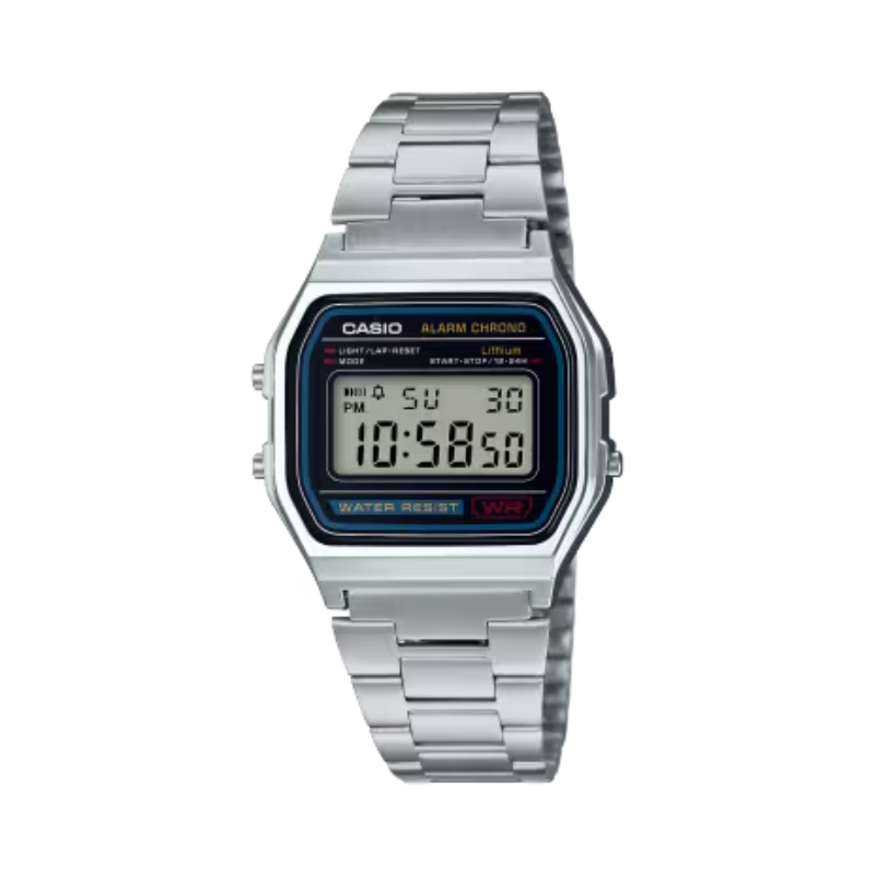 Reloj digital clásico unisex con correa de acero inoxidable, alarma, cronómetro, luz LED y 7 años de baterÃa. Resistencia básica al agua (salpicaduras).