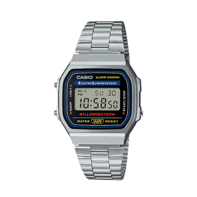 Reloj con luz de fondo electroluminiscente que ilumina toda la pantalla. Funciones de cronómetro, alarma y resistencia básica al agua (salpicaduras).