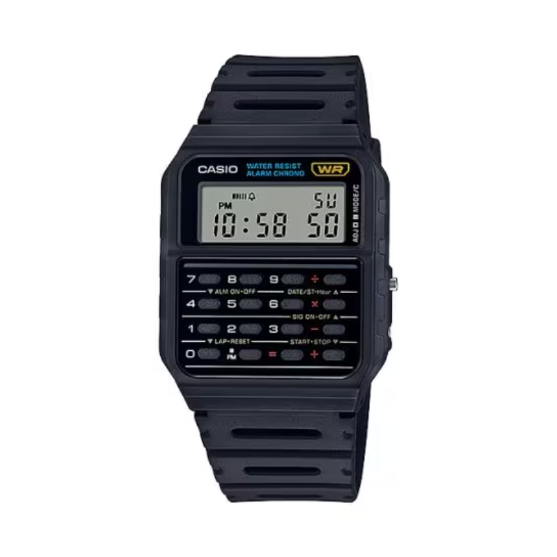 Clásico modelo retro con calculadora de 8 dígitos integrada en el teclado. Funciones básicas de cronómetro y alarma. Resistencia mínima al agua (salpicaduras).