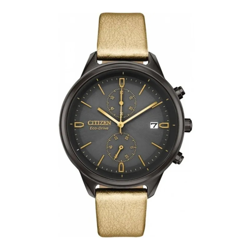 Reloj de dama Eco-Drive con caja gris, carátula gris oscuro, cronógrafo y una elegante correa de piel vegana dorada. WR: 50 metros Cristal: Minera