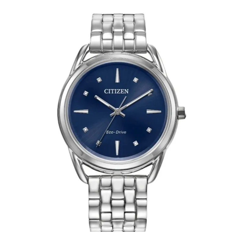 Reloj de dama con movimiento Eco-Drive en acero inoxidable plateado y carátula azul cobalto con tres manecillas.