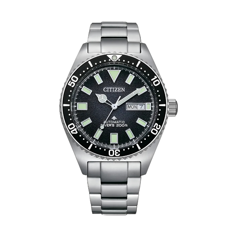 Reloj de buceo profesional certificado ISO 6425 para caballero, con movimiento automático. Similar al modelo anterior, pero con un brazalete de acero inoxidable y carátula negra. Cuenta con bisel giratorio unidireccional y corona roscada.